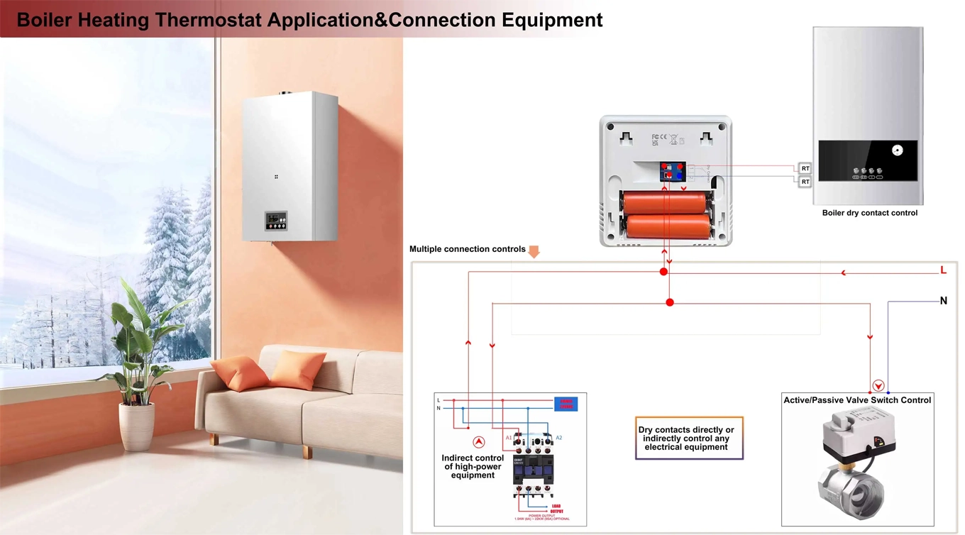 Dieses batteriebetriebene Thermostat ist für den einfachen Anschluss an die meisten Trockenkontakt-Heizkessel konzipiert und gewährleistet eine präzise Steuerung der Heizung. Die Rückseite zeigt übersichtlich die entsprechenden Anschlüsse an und ermöglicht zudem die indirekte Ansteuerung leistungsstärkerer Geräte über externe Relais. Die Einrichtung ist intuitiv und sicher – ideal für Standard-Hausinstallationen und moderne Heizsysteme, die eine einfache und zuverlässige Schnittstelle erfordern.