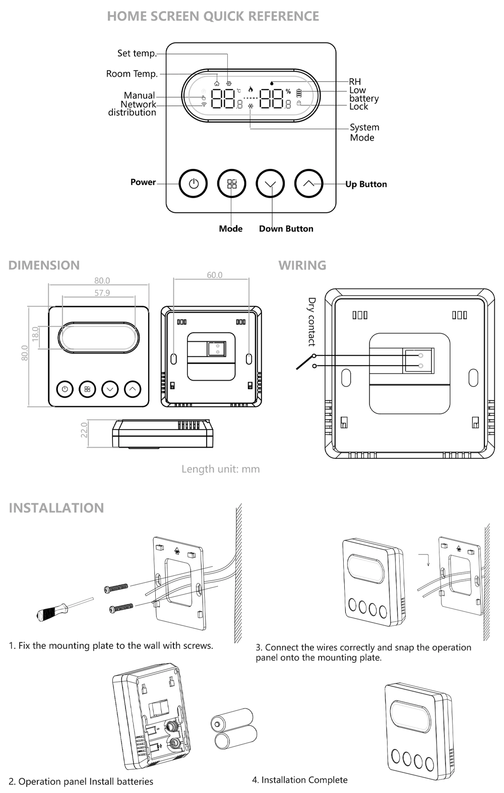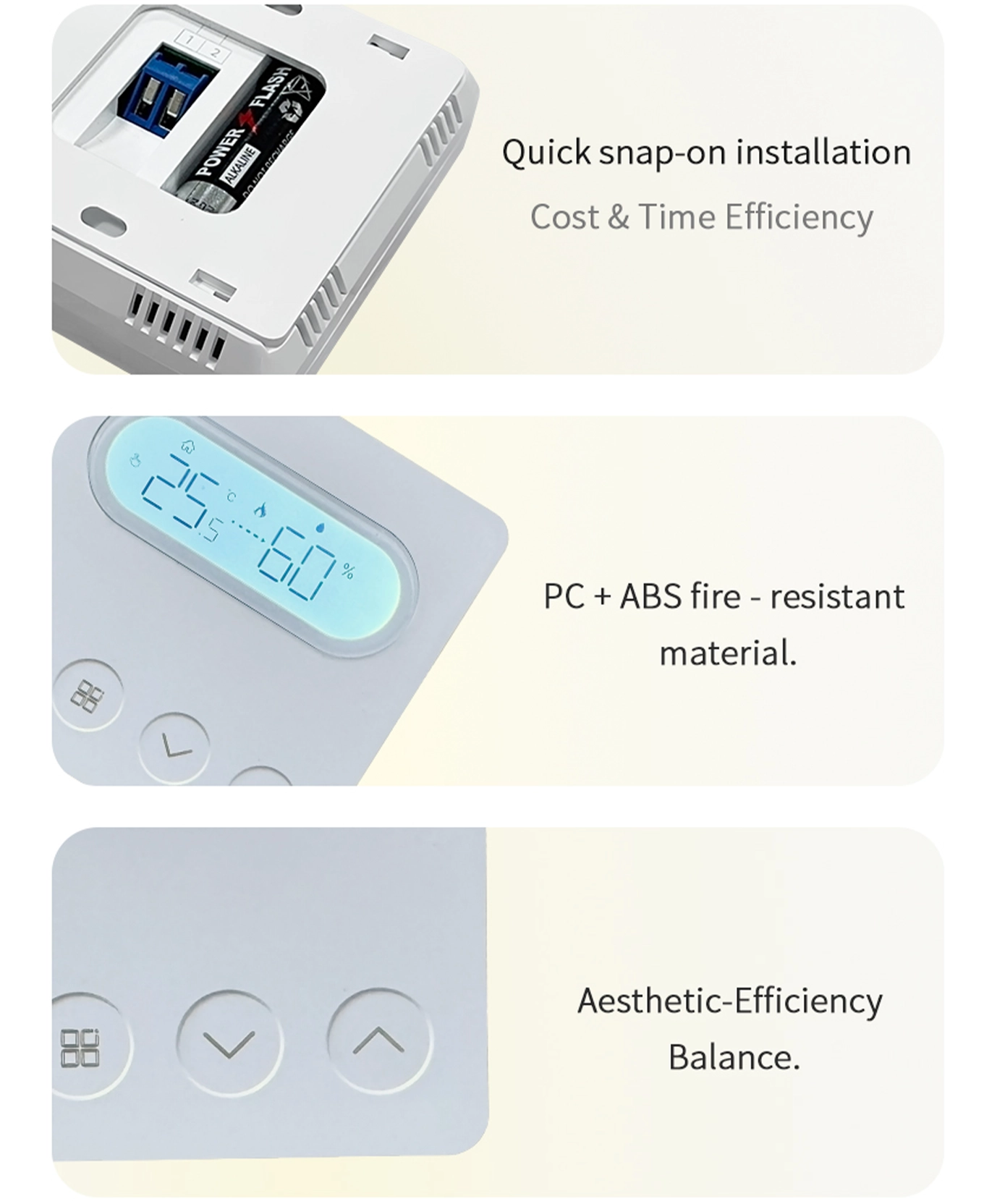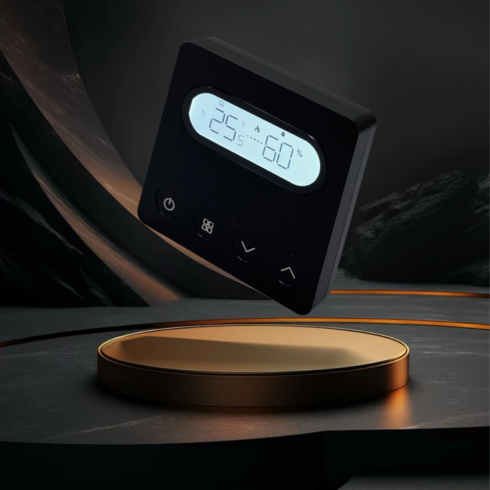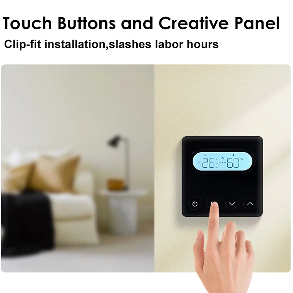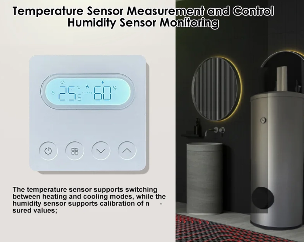 Das Thermostat ist mit einem hochpräzisen Temperatursensor ausgestattet, der die Heizmodi des Raumes automatisch steuert. Das Display zeigt die eingestellte Temperatur und die gemessene Luftfeuchtigkeit in Echtzeit an, während der Feuchtigkeitssensor eine manuelle Kalibrierung ermöglicht, um stets zuverlässige Messwerte zu gewährleisten. Für optimalen Wohnkomfort – ideal zur Klimatisierung jedes Raumes.