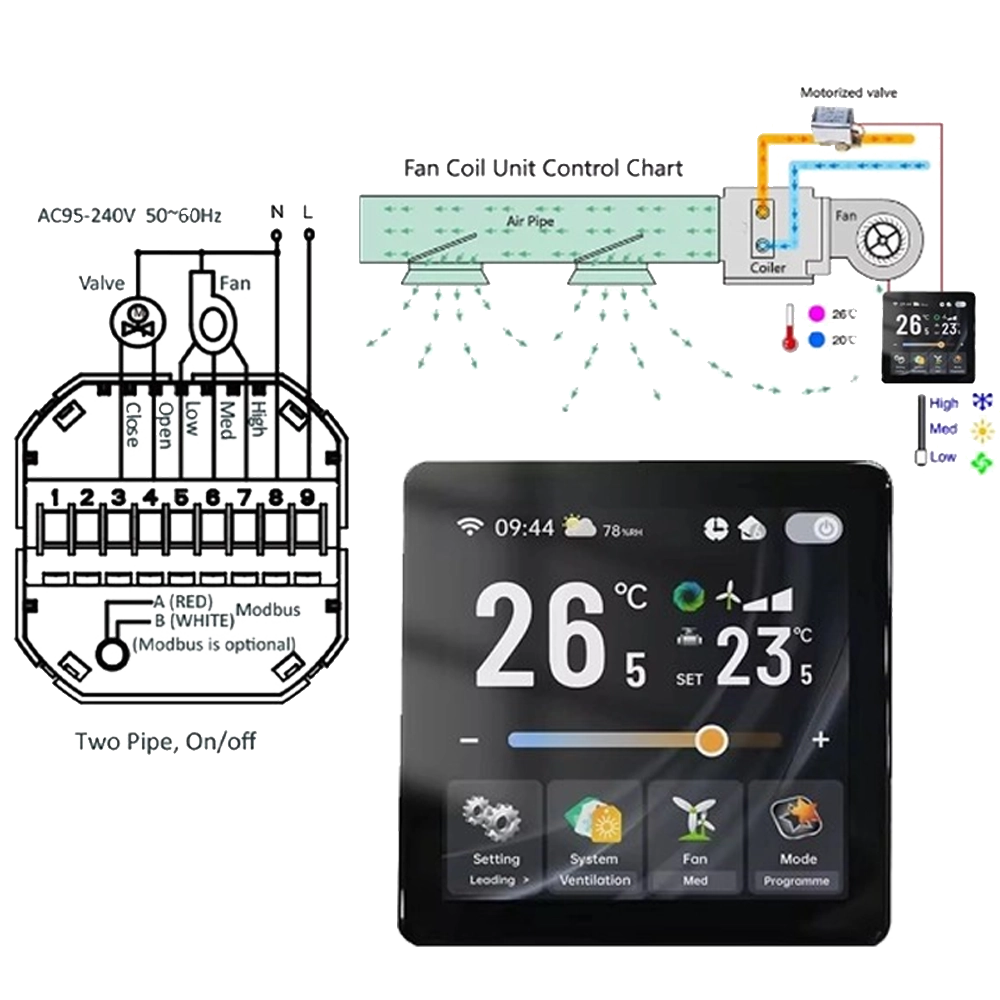 Der Beca BAC-2005ALW verwaltet 2-Rohr -Gebläsekonvektoren präzise: Er steuert das EIN/AUS-Ventil und den 3-stufigen Ventilator (Niedrig/Mittel/Hoch) direkt über das 4-Zoll-IPS- Farb-Touchpanel (480 x 480) aus gehärtetem Glas . Er unterstützt Heizung, Kühlung und Lüftung , 7-Tage-/6-Perioden-Wochenprogrammierung , Speicher nach Stromausfall und Tastensperre/Kindersicherung . Mit 2,4-GHz-WLAN und der Smart Life-/ Tuya -App verfügen Sie über Fernsteuerung, Temperaturstatistiken, gemeinsame Nutzung mehrerer Räume/Gruppen und Sprachbefehle mit Amazon Alexa und Google Home . Stromversorgung 95–240 VAC .