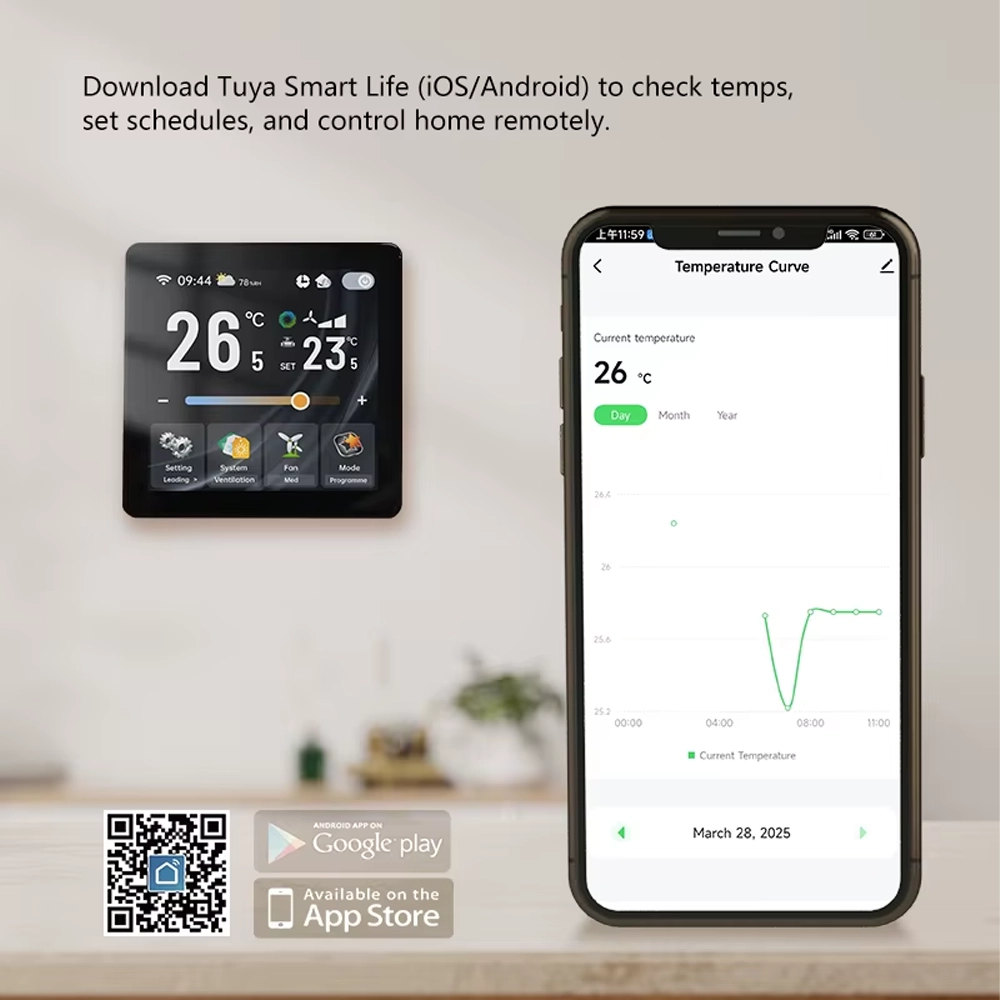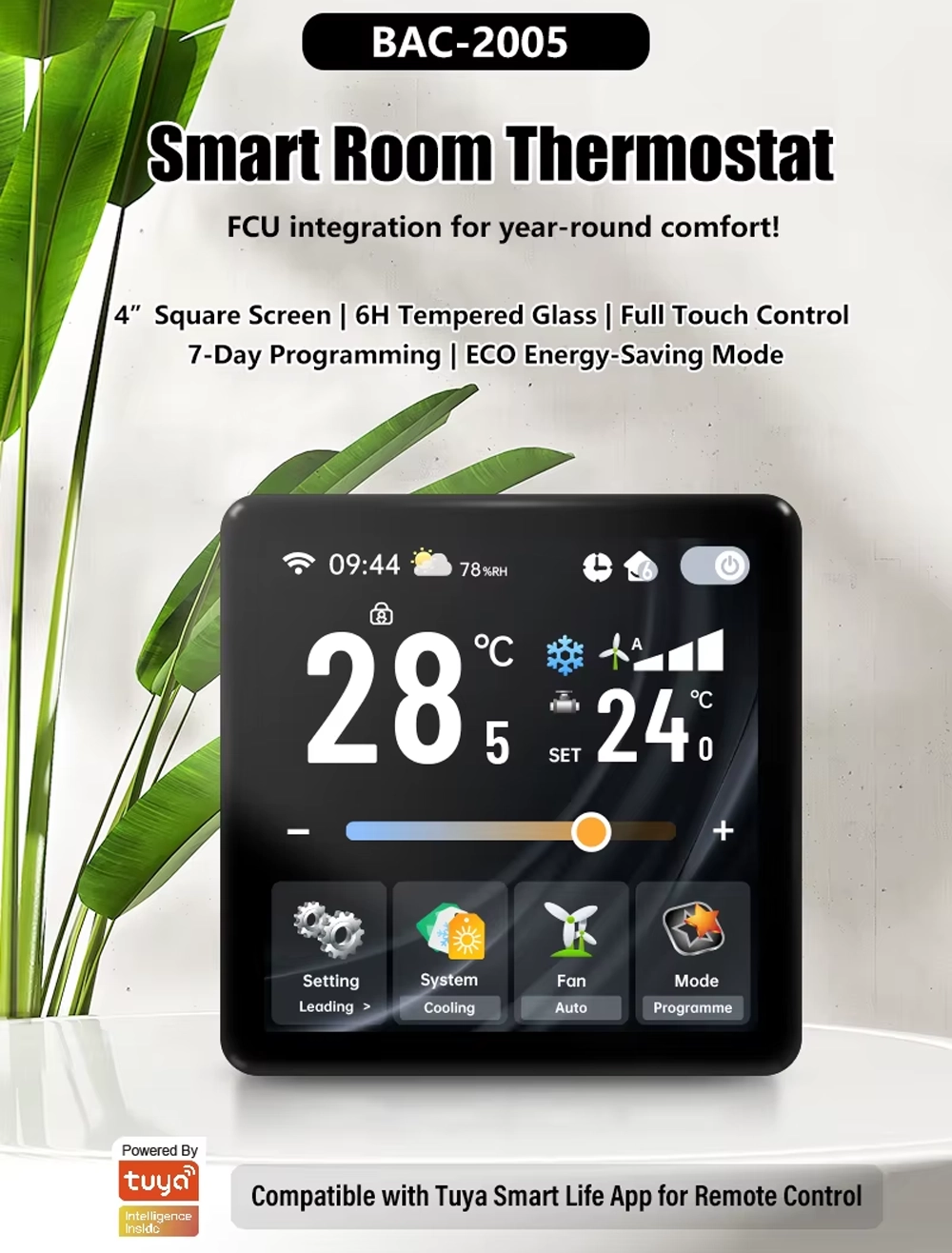 Der Beca BAC-2005ELW ist der intelligente WLAN-Thermostat für 4-Rohr-Gebläsekonvektoren : Er steuert zwei EIN/AUS-Ventile (unabhängiger Warm- und Kaltkreislauf ) und den 3-stufigen Lüfter ( Niedrig/Mittel/Hoch ) und gewährleistet so sofortiges Umschalten zwischen Warm und Kalt sowie konstanten Komfort das ganze Jahr über. Der 4-Zoll-IPS-Farb-Touchscreen (480 x 480) aus 6H-Hartglas gewährleistet klares Ablesen und schnelle Steuerung. Mit 2,4-GHz-WLAN und der Smart Life/ Tuya -App können Sie Programme, Szenen und Mehrraumgruppen fernverwalten; mit Alexa und Google Assistant können Sie Temperatur, Modus und Lüftergeschwindigkeit per Sprache anpassen. 7-Tage-/6-Perioden -Programmierung, ECO-Modus , Kindersicherung , Anti-Blackout-Speicher und 95–240-VAC-Stromversorgung vervollständigen eine zuverlässige Lösung für Wohnungen, Büros, Hotels und Geschäfte.