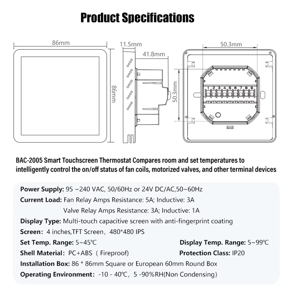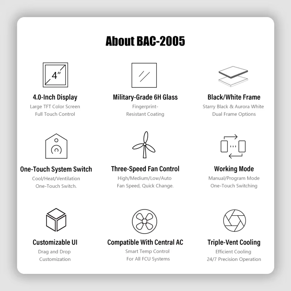 Der Beca BAC-2005ELW Smart WiFi Thermostat bietet ein 4" 480×480 IPS-Display aus oleophobem 6H-Hartglas mit einem Schnellsymbolmenü zur sofortigen Verwaltung wichtiger Funktionen: Uhr , Netzwerkkopplung , 7-Tage-/6-Perioden-Programm , ECO-Modus , Helligkeit , Temperaturkalibrierung , Kindersicherung und Geräteinfo . Klare und reaktionsschnelle Schnittstelle für präzise Einstellungen und schnelle Wartung, ideal für 4-Rohr- Gebläsekonvektoren mit EIN/AUS-Ventil und 3-stufigem Lüfter .