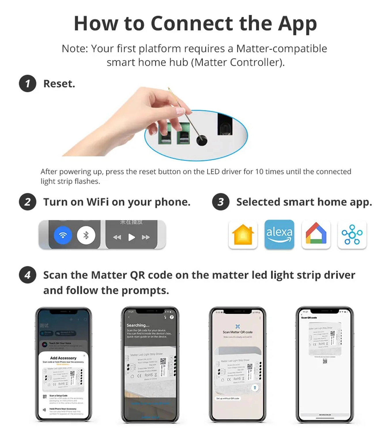 Die Einrichtung des Tuya Matter Smart Controllers ist schnell und einfach. So verbinden Sie ihn mit Ihrem Smart-Home-System: Drücken Sie die Reset-Taste 10 Mal, bis die Kontrollleuchte des Controllers blinkt. Aktivieren Sie WLAN auf Ihrem Smartphone. Wählen Sie Ihre bevorzugte Smart-Home-App (Alexa, Google Home, Tuya Smart, Smart Life, Apple Home oder SmartThings). Scannen Sie den Matter-QR-Code auf dem Gerät und folgen Sie den Anweisungen, um die Kopplung abzuschließen. Innerhalb weniger Minuten können Sie Ihre LED-Streifen dank maximaler plattformübergreifender Kompatibilität durch das Matter-Protokoll direkt über die App steuern – egal wo Sie sind.