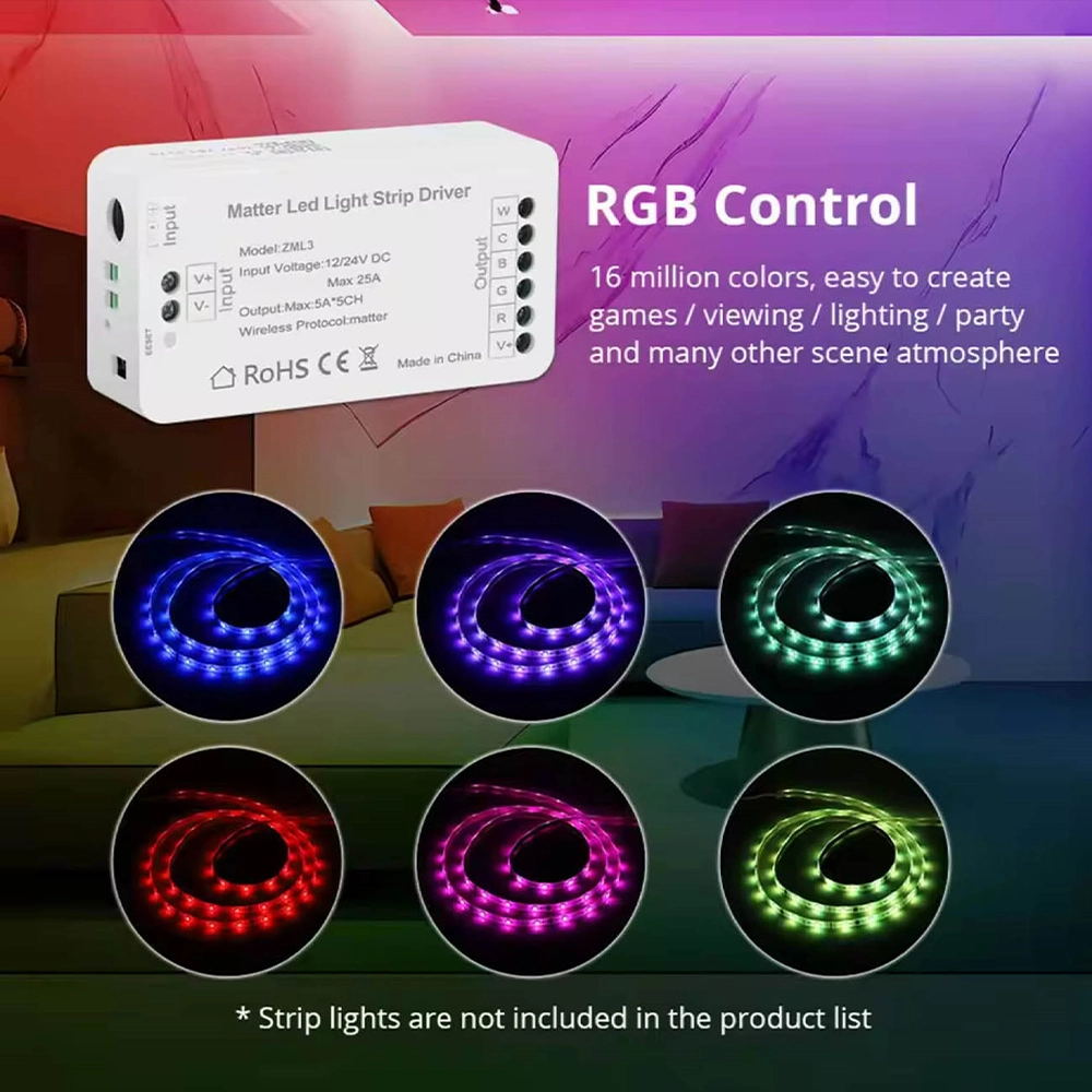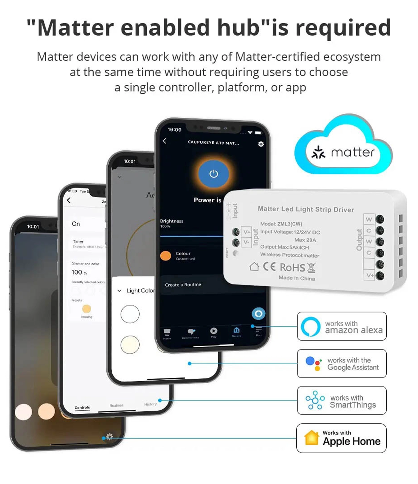 Der Tuya WiFi Matter Smart Controller ist mit allen Matter-zertifizierten Systemen kompatibel und bietet eine nahtlose Integration in führende Smart-Home-Plattformen. Steuern Sie Ihre LED-Streifen bequem per Alexa, Google Assistant, Apple HomeKit und SmartThings – ohne separate Apps oder komplizierte Einrichtung. Für die zentrale Verbindung und Verwaltung all Ihrer Smart-Home-Geräte ist ein Matter-kompatibler Hub erforderlich. Mit nur einem Controller passen Sie Farben, Helligkeit und Lichtszenen von jedem angeschlossenen Gerät aus an und vereinfachen so die Lichtsteuerung in Ihrem gesamten Zuhause. Ideal für alle, die ein interoperables, sicheres und plattformübergreifendes Smart-Lighting- System suchen.
