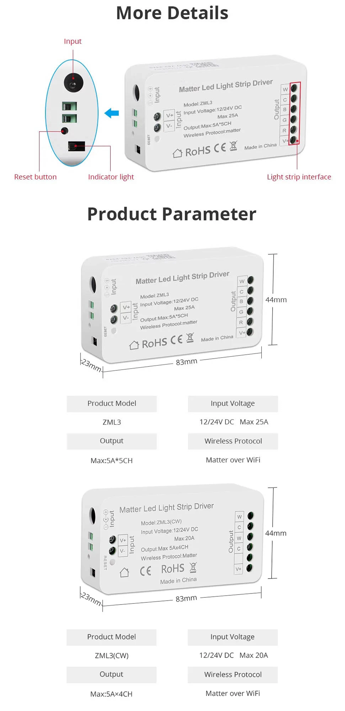 Der Tuya Matter WLAN-Controller ist mit den meisten 12-V- oder 24-V-DC-LED-Streifen kompatibel, einschließlich CCT (dimmbares Weiß) und RGBCCT (RGB-Farben + Warm-/Kaltweiß). Er eignet sich perfekt für unsere COB-LED-Streifen und gewährleistet gleichmäßige Farben, stabile Helligkeit und eine lange Lebensdauer.