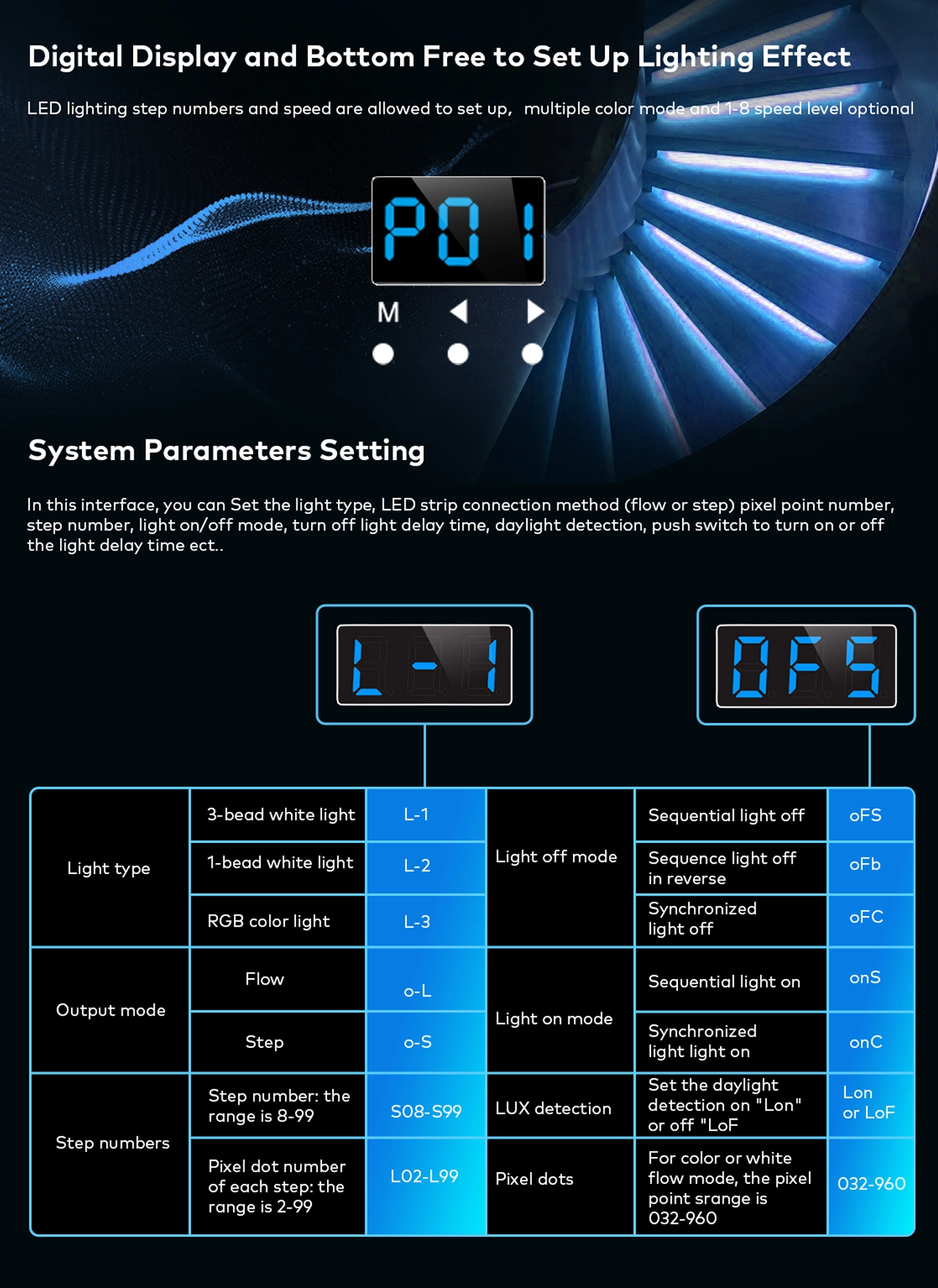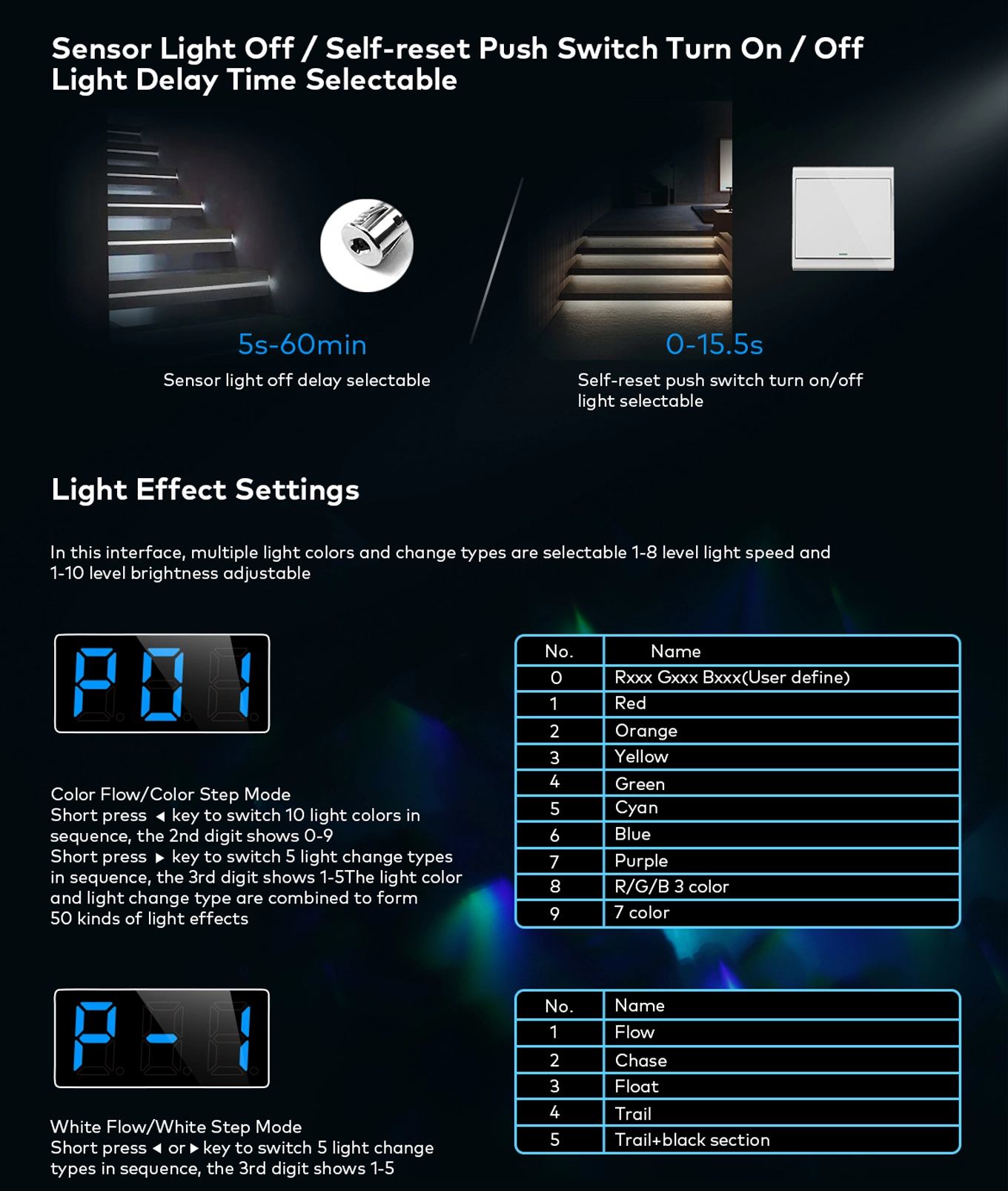 Der Controller verfügt bereits über einen integrierten Lichtsensor , sodass keine zusätzlichen Module benötigt werden. Sie können die Treppenbeleuchtung so einstellen, dass sie sich nur bei Dunkelheit einschaltet, und die Ausschaltverzögerung von 5 Sekunden bis 60 Minuten anpassen, sodass das Licht nur so lange brennt wie nötig. Auch die automatische Rücklauftaste kann mit einer individuell einstellbaren Ein-/Ausschaltzeit (0–15,5 s) versehen werden – ideal für Flure, Rampen oder schnell frequentierte Durchgänge.
