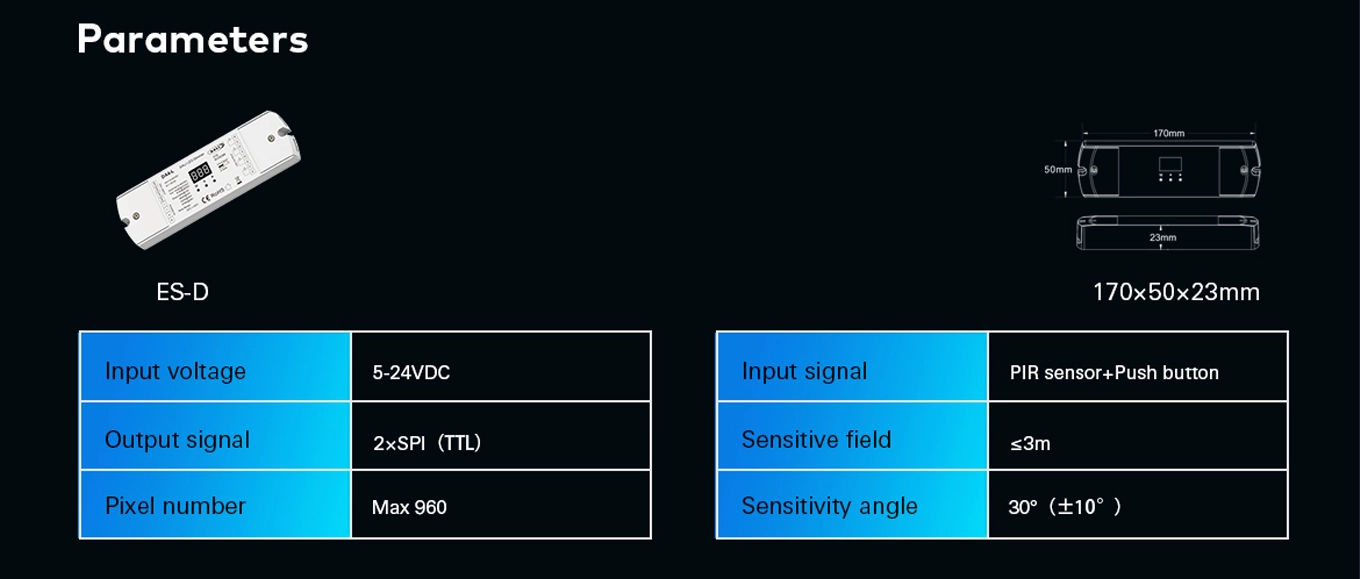 🔗 Dualer SPI (TTL)-Ausgang: Bis zu 960 steuerbare Pixel, mit der Möglichkeit, mehrere Controller auf demselben Knopf zu kaskadieren, um lange Rampen oder mehrere Zonen zu realisieren.