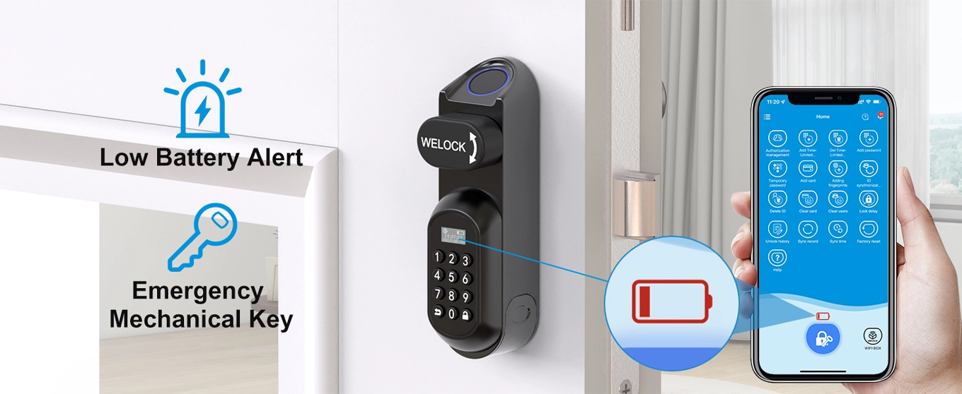 Das WELOCK U81 kombiniert intelligente Technologie mit dem Komfort eines herkömmlichen Schlüssels und gewährleistet so sicheren Zugang in jeder Situation. Selbst wenn die Batterien leer sind oder Ihr Telefon nicht verfügbar ist, können Sie mit dem integrierten mechanischen Schlüssel die Tür schnell und sicher öffnen.
