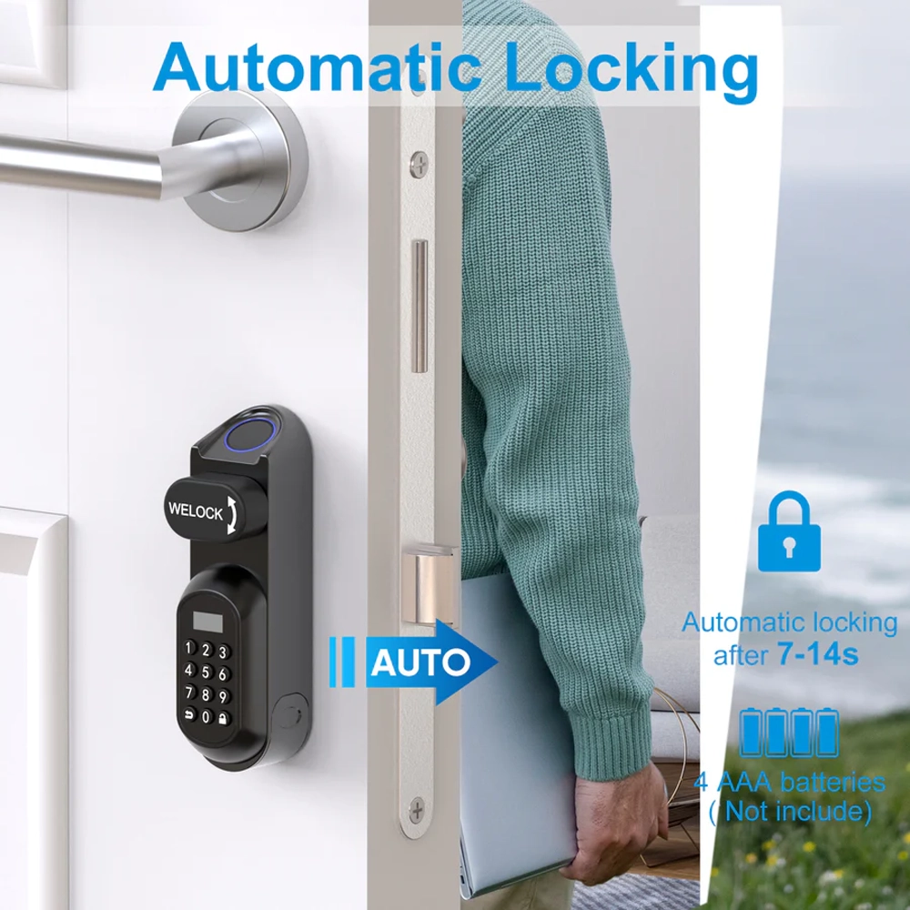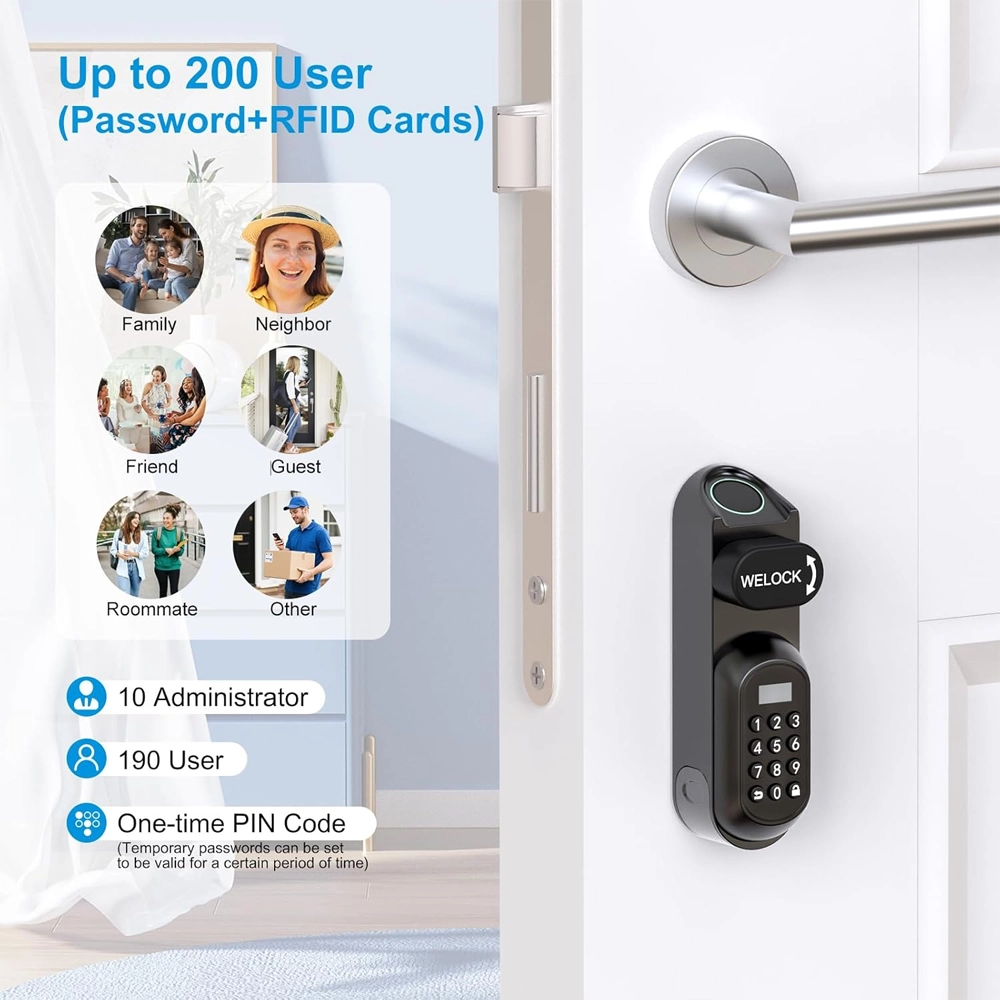 Öffnen Sie die Tür mit Ihrem Smartphone , Ihrer persönlichen PIN oder RFID-Karte , ohne dass Sie physische Schlüssel benötigen. Mit der WELOCK -App können Sie bis zu 200 Benutzer verwalten, darunter 10 Administratoren und 190 reguläre Benutzer, und Familienmitgliedern, Gästen oder Servicepersonal temporäre Codes oder digitale eKeys zuweisen.