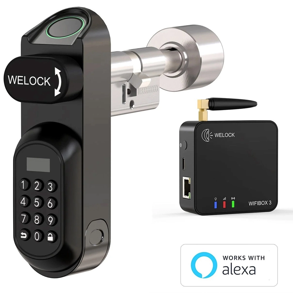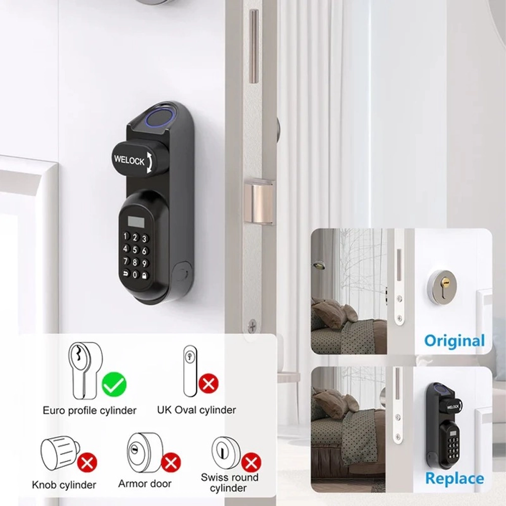 Entdecken Sie WELOCK U81 , das intelligente elektronische Schloss, das Ihre Tür in einen intelligenten, sicheren und schlüssellosen Zugangspunkt verwandelt. Mit seinem modernen Design und den erweiterten Funktionen ist es die ideale Lösung für Wohnungen, Büros, Pensionen und Ferienhäuser und bietet Kontrolle, Sicherheit und Komfort in einem einzigen Gerät. Dank des integrierten Bluetooth- Systems und der WELOCK-App können Sie bis zu 200 Benutzer verwalten, darunter Administratoren und Gäste, den Zugang in Echtzeit überwachen und temporäre oder permanente Codes erstellen. Sie können die Tür auf 6 verschiedene Arten öffnen: per Fingerabdruck , PIN , RFID-Karte , Smartphone-App , mechanischem Schlüssel oder aus der Ferne mit dem WiFiBox3-Gateway (optional). Die Schutzart IP65 macht es wasser- und staubdicht und somit auch perfekt für den Außeneinsatz geeignet. Es funktioniert problemlos zwischen -25 °C und +60 °C . Außerdem garantieren die automatische Verriegelung und die Manipulationsschutzfunktion maximale Sicherheit für Sie und Ihre Familie. Die Batterie hält mit 4 AAA-Batterien bis zu einem Jahr und im Notfall können Sie die Tür mit dem physischen Schlüssel oder über eine Powerbank aufschließen. Die Installation ist schnell und einfach: Ersetzen Sie einfach den vorhandenen Eurozylinder, ohne das Originalschloss zu bohren oder zu modifizieren – in weniger als 5 Minuten ist Ihre intelligente Tür einsatzbereit .