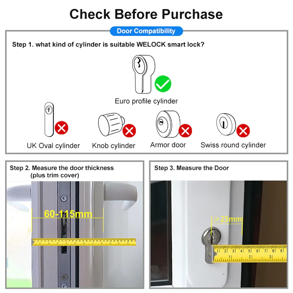 Ersetzen Sie nur den Schließzylinder, ohne das Originalgehäuse zu verändern: Die Installation ist schnell, ohne Bohren oder Verkabeln , und kann in weniger als 5 Minuten abgeschlossen werden. Das WELOCK U81 Smart Lock ist an verschiedene Türtypen anpassbar. Zylinderlänge: außen 30–45 mm / innen 30–70 mm. Kompatible Türstärke: 50 bis 95 mm. Abstand von der Mitte des Schlosslochs zum Rahmen: ≥ 25 mm