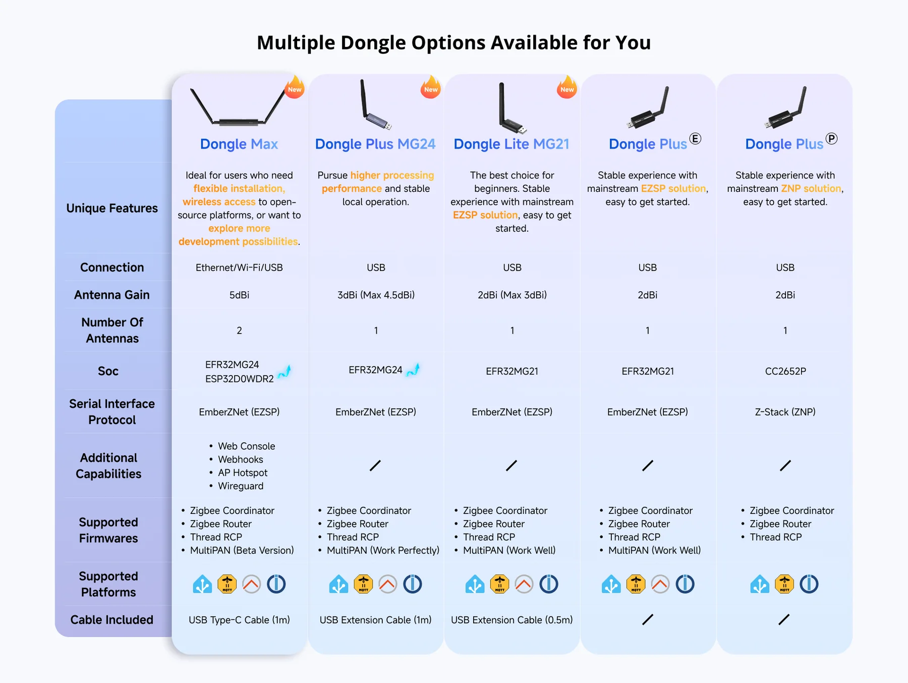 Abgesehen vom Aussehen unterscheiden sich Dongle Lite MG21 und ZBDongle-P in ihrem Chipsatz und der unterstützten Plattform. Der Dongle Lite MG21 verwendet den EFR32MG21, während der ZBDongle-P den CC2652P nutzt. Der Dongle Lite MG21 unterstützt openHAB, der ZBDongle-P hingegen noch nicht.