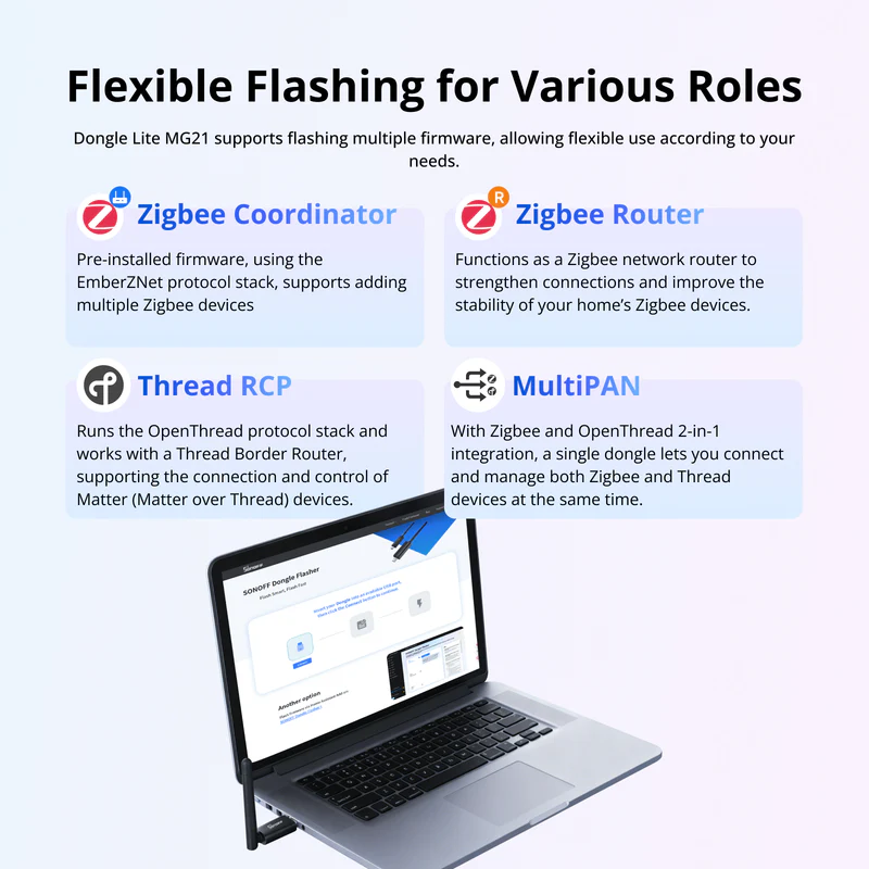Der Sonoff MG21 ZigBee USB-Dongle unterstützt verschiedene Firmware-Versionen und passt sich so Ihren Smart-Home-Anforderungen an. Er kann als ZigBee-Koordinator zur Verwaltung mehrerer Geräte, als ZigBee-Router zur Netzwerkerweiterung und -stabilitätsverbesserung oder als Thread RCP zur Verbindung von Matter- kompatiblen Geräten fungieren. Dank des MultiPAN- Modus vereint er ZigBee und Thread in einer einzigen Lösung, sodass Sie mehrere Protokolle gleichzeitig mit einem einzigen Dongle verbinden und steuern können.