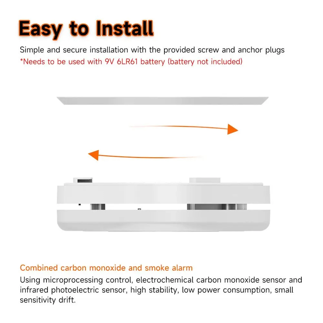 Der Tuya ZigBee Rauch- und Kohlenmonoxidmelder lässt sich mit den mitgelieferten Schrauben und Dübeln in wenigen Minuten installieren: Befestigen Sie einfach die Basis an Decke oder Wand und montieren Sie den Sensor – ganz ohne Kabelverlegung oder Eingriffe in die Elektrik. Er wird mit einer 9V 6LR61 Batterie (nicht im Lieferumfang enthalten) betrieben und eignet sich ideal für die Nachrüstung von Küchen, Fluren, Wohnzimmern und Schlafzimmern mit einem intelligenten Alarmsystem, ohne dass Maurerarbeiten erforderlich sind.