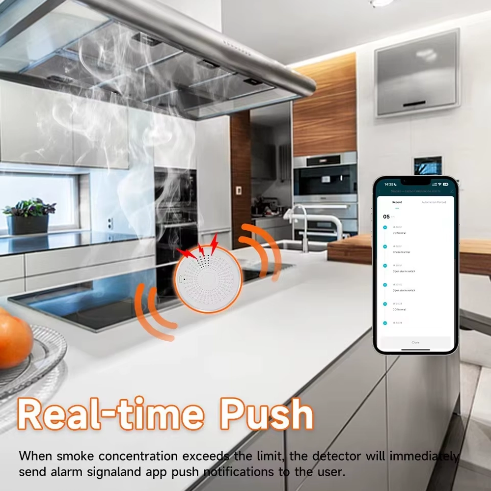 Der smarte Rauch- und Kohlenmonoxidmelder Tuya ZigBee aktiviert innerhalb von Sekunden eine 85 dB laute Sirene und sendet eine Echtzeit-Benachrichtigung an Ihr Smartphone , sobald er Rauch oder Kohlenmonoxid im Raum erkennt. In Verbindung mit der Tuya oder Smart Life- App können Sie die Luftqualität aus der Ferne überwachen und auch unterwegs Benachrichtigungen erhalten. So erhöhen Sie die Sicherheit in Küche, Wohnzimmer, Flur und Hauswirtschaftsraum. Dank des lauten Alarms und der Push-Benachrichtigung ist dieser Sensor ideal für smarte Rauch- und Kohlenmonoxid -Schutzsysteme in Privathaushalten, Pensionen und Büros.