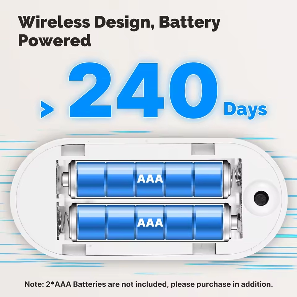 Freuen Sie sich über die kabellose Installation und den minimalen Wartungsaufwand: Dank des extrem niedrigen Stromverbrauchs hält der Sensor >240 Tage . Benötigt 2 austauschbare AAA-Batterien (nicht im Lieferumfang enthalten).