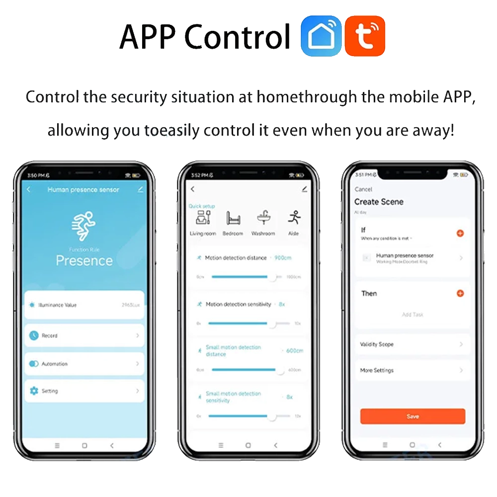 Der Sensor eignet sich perfekt für verschiedene Umgebungen: Eingänge und Büros , Flure und Badezimmer . Mit der Tuya oder Smart Life-App – oder mit Home Assistant über Zigbee – erstellen Sie mit wenigen Fingertipps automatische Szenen . Einfache Automatisierungen reduzieren den Verbrauch und verbessern Komfort und Sicherheit, indem sie Licht, Lüftung und Klimaanlage nur dann aktivieren, wenn tatsächlich jemand anwesend ist. Beispiele aus der Praxis: