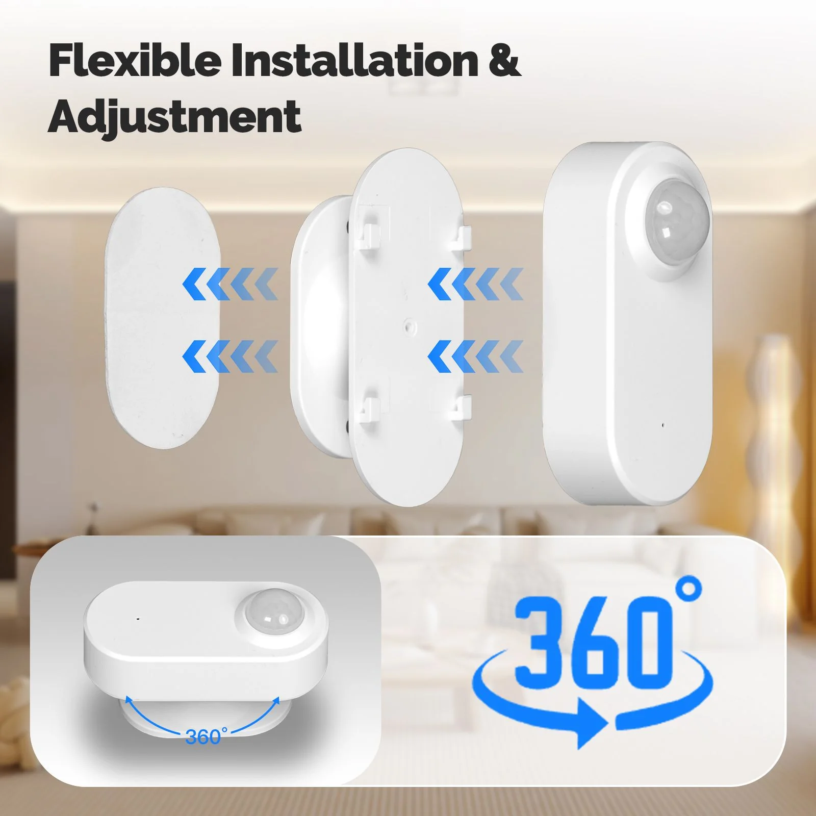 Der Sensor verfügt über eine Schnellwechselplatte und einen um360° drehbaren Sockel : Platzieren Sie ihn einfach an Wand oder Decke , stellen Sie den Winkel in Sekundenschnelle ein und positionieren Sie ihn bei Bedarf neu – ganz ohne Werkzeug. Der modulare Aufbau gewährleistet eine saubere Installation und eine präzise Ausrichtung des zu überwachenden Bereichs.