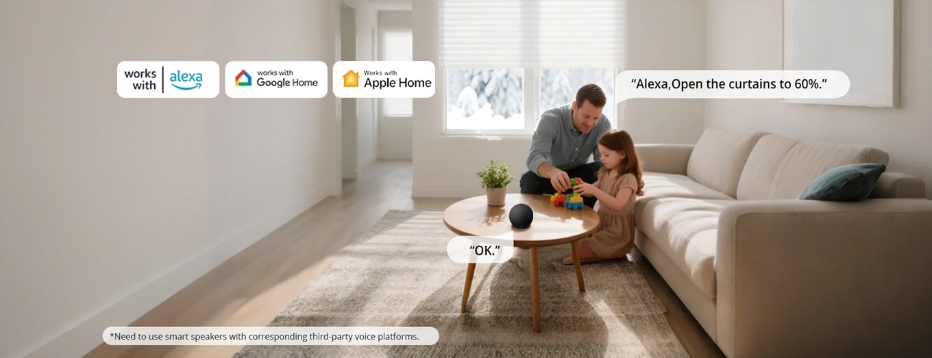 🎙️ Intelligente Sprachsteuerung: Unterstützt Sprachbefehle über Alexa, Google Assistant und Siri, sodass Sie Ihre Vorhänge einfach per Sprachbefehl öffnen oder schließen können.