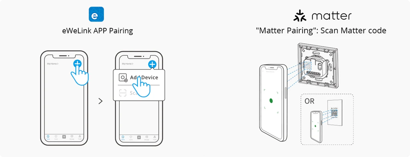 Die Einrichtung des Sonoff Orb-RBS ist schnell und einfach. Sie haben die Wahl zwischen zwei Kopplungsmethoden: über die eWeLink -App oder mit einer Matter-kompatiblen Plattform. Mit eWeLink fügen Sie das Gerät einfach über die App hinzu, um alle Smart-Funktionen wie Timer, Kalibrierung und Fernsteuerung zu verwalten. Alternativ können Sie den Matter-Code verwenden, um den Schalter schnell in Ihr bevorzugtes Smart-Home-System zu integrieren. In nur wenigen Minuten ist das Gerät bereit für die Steuerung per Smartphone oder Sprachbefehl.