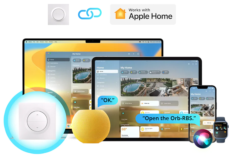 Dank der nativen Apple Home- Unterstützung integriert sich der Sonoff Orb-RBS- Schalter nahtlos in Siri, iPhone, iPad und Apple Watch . Steuern Sie Ihre Jalousien mit einem einfachen Sprachbefehl wie „Hey Siri, öffne die Jalousien“ oder verwalten Sie sie bequem per Sprachbefehl über die Home -App. Mit Matter erfolgt die Kopplung blitzschnell und sicher – für volle Kompatibilität und ein intelligentes Nutzererlebnis, perfekt synchronisiert mit dem gesamten Apple-Ökosystem.