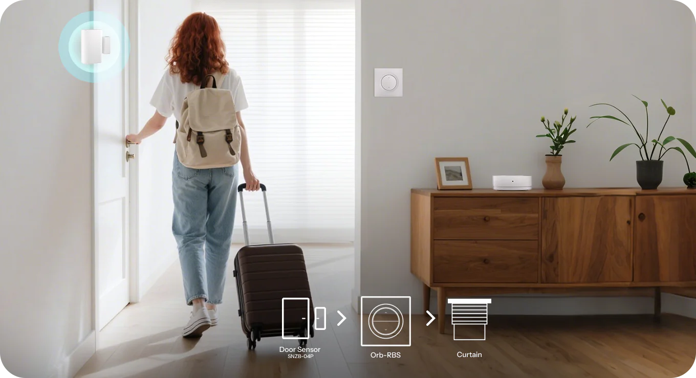 Verbinden Sie Orb-RBS mit SONOFF Zigbee-Sensoren (Tür/Fenster, Bewegung, Helligkeit) und erstellen Sie automatische Szenen mit eWeLink : Wenn Sie die Tür öffnen, senkt sich der Rollladen für mehr Privatsphäre ; wenn das Licht schwächer wird, schließt er sich fast vollständig; im Abwesenheitsmodus schließt er sich zu 100 %.