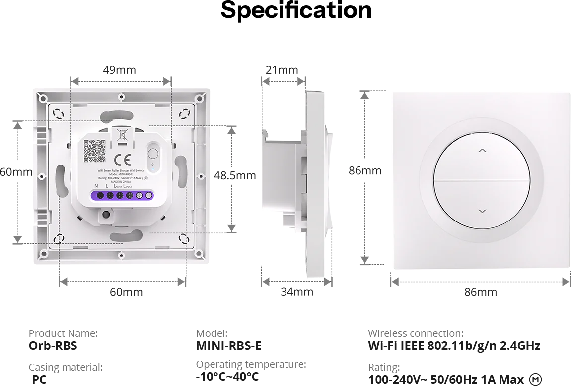 Der SONOFF Orb-RBS ist ein intelligenter Wandschalter für Rollläden, der mit dem Matter-Protokoll über ein 2,4-GHz-WLAN-Netzwerk kompatibel ist. Er ermöglicht die präzise Einstellung der Öffnung (z. B. 30 %, 70 %), die Programmierung der Öffnungs-/Schließzeiten und die Umkehrung der Motordrehrichtung ohne zusätzliche Verkabelung. Er erfordert eine Verkabelung mit Neutralleiter, ist kompatibel mit Apple Home, Google Home, Alexa und SmartThings und ist für die Installation in Standard-Unterputzdosen mit den Maßen 86×86×34 mm ausgelegt.