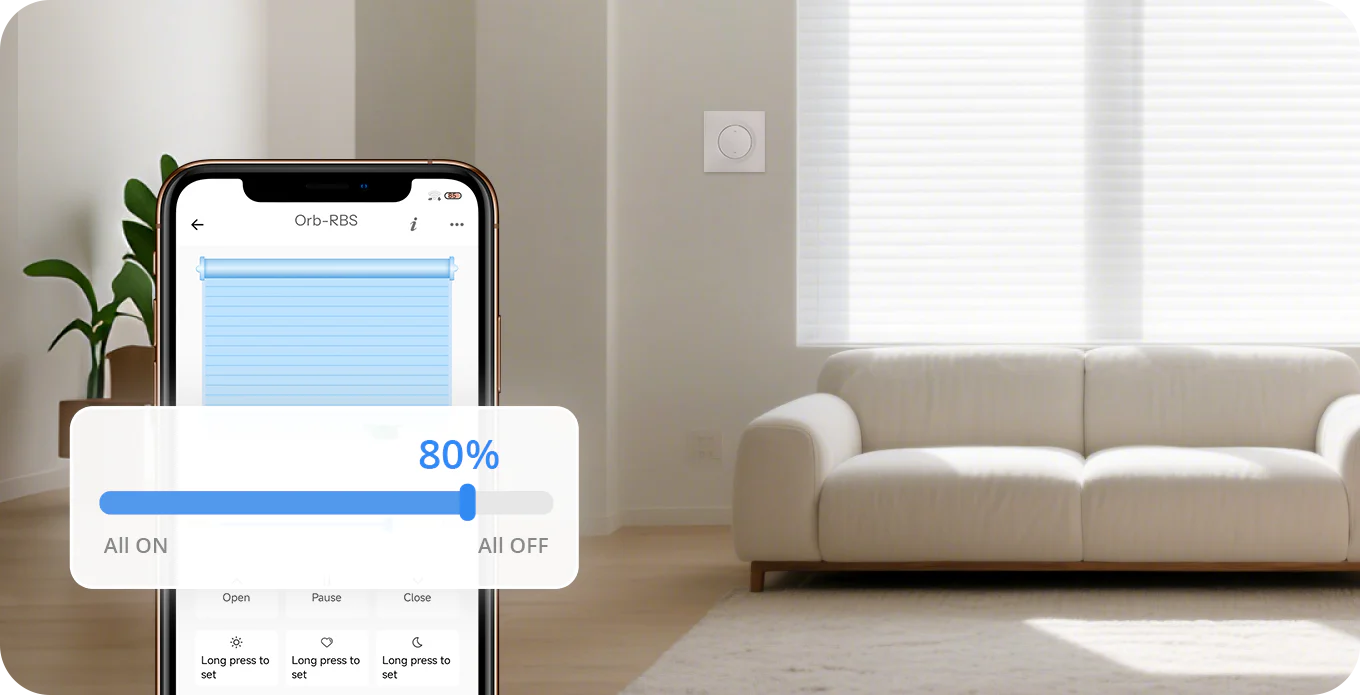 Dank der prozentualen Öffnungssteuerung können Sie Ihre motorisierten Jalousien und Vorhänge mit höchster Präzision einstellen. Stellen Sie beispielsweise 30 % ein, um morgens sanftes Licht hereinzulassen, oder 70 %, um das stärkste Sonnenlicht abzuschirmen – ganz einfach über die eWelink-App oder per Sprachbefehl. Mit Sonoff Orb-RBS haben Sie jede Position unter Kontrolle und schaffen so zu jeder Tageszeit das perfekte Maß an Komfort und Helligkeit.