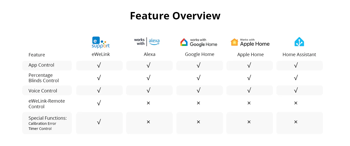 Der Sonoff Orb-RBS bietet dank seiner Multiplattform-Unterstützung umfassende und flexible Steuerungsmöglichkeiten für Ihre smarten Jalousien und Vorhänge. Er ist kompatibel mit Alexa, Google Home, Apple Home, Home Assistant und eWeLink und ermöglicht Ihnen so die Steuerung Ihrer Jalousien, die präzise Einstellung von Prozentwerten, die Aktivierung von Sprachbefehlen und die vollständige Kontrolle über die App. Mit der eWeLink App erhalten Sie zudem erweiterte Funktionen wie die automatische Kalibrierung und individuell anpassbare Timer für eine noch präzisere und automatisierte Steuerung.