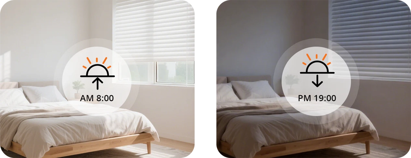 Mit dem Sonoff Orb-RBS können Sie intelligente Timer einstellen, die Ihre Jalousien und Vorhänge automatisch an Ihren Tagesrhythmus anpassen. Genießen Sie morgens um 8:00 Uhr natürliches Licht und schließen Sie Ihre Jalousien abends um 19:00 Uhr bei Sonnenuntergang – ganz ohne Aufwand. Dank der intelligenten Steuerung per App oder Sprachbefehl erstellen Sie personalisierte Routinen , die Ihren Komfort, Ihre Energieeffizienz und Ihre Lebensqualität verbessern.