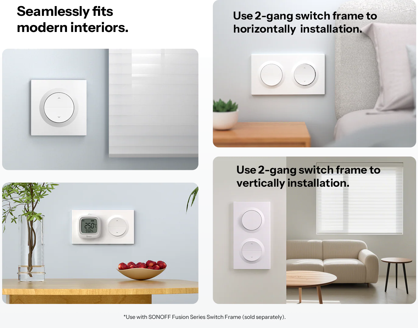 Die quadratische, neutralweiße Frontblende und der schlichte zentrale Drehknopf lassen den Sonoff Orb-RBS harmonisch in moderne Einrichtungen und Rollos einfügen. Die flächenbündige Montage sorgt für ein aufgeräumtes Erscheinungsbild in Wohn- und Schlafbereichen, während die spezielle Tastenbedienung das Öffnen und Schließen der Rollos sowie die Einstellung des Öffnungsgrades erleichtert. Der separat erhältliche 2-fach-Rahmen ermöglicht die horizontale Montage, sodass zwei Bedienelemente nebeneinander in derselben Leuchte angebracht werden können.