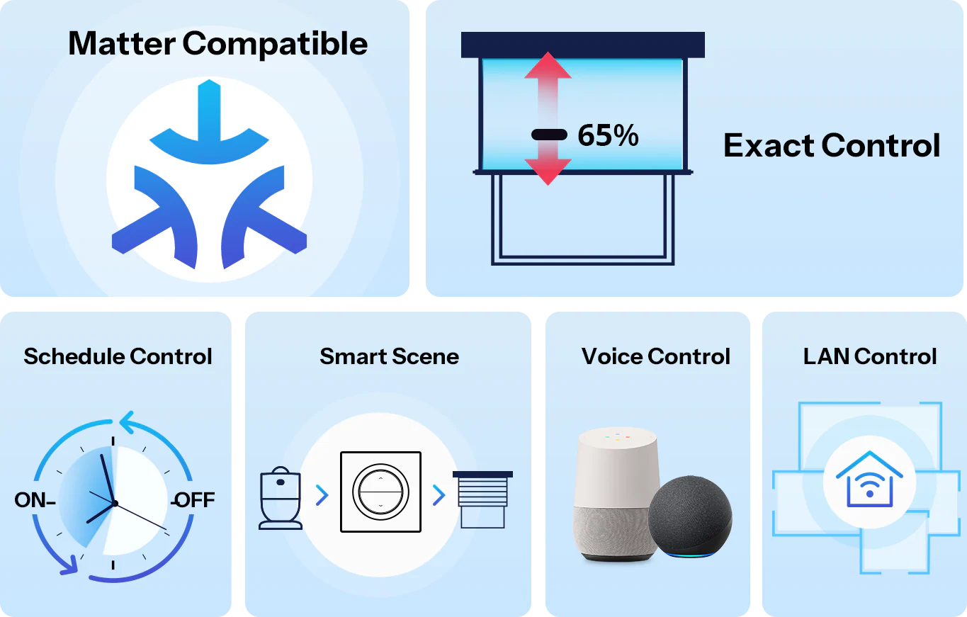 📱 eWeLink oder Matter-App-Steuerung: Steuern Sie Ihre Rollläden und Vorhänge direkt von Ihrem Smartphone aus über die eWeLink App oder eine beliebige Matter-kompatible App, egal wo Sie sich befinden.