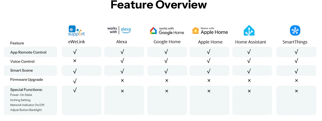 Der Sonoff TX Gen2 ist für die Integration in das Matter-Ökosystem konzipiert, den universellen Smart-Home-Standard, der Geräte verschiedener Marken miteinander kompatibel macht. Das bedeutet, dass Sie den Schalter nicht nur mit der eWeLink -App, sondern auch mit Apple Home, Google Home, Alexa, Samsung SmartThings und Home Assistant steuern und alles von einer einzigen Plattform aus verwalten können.